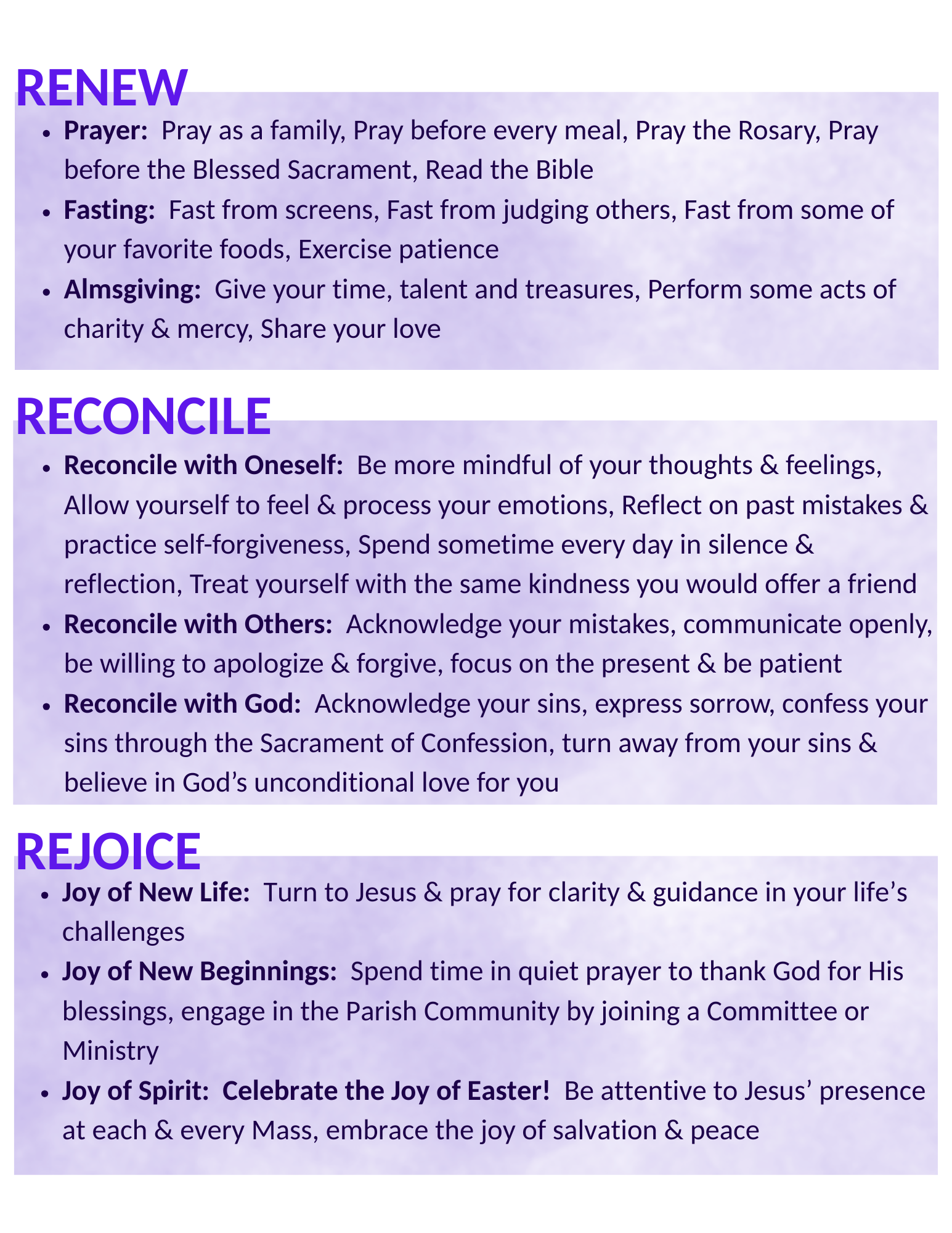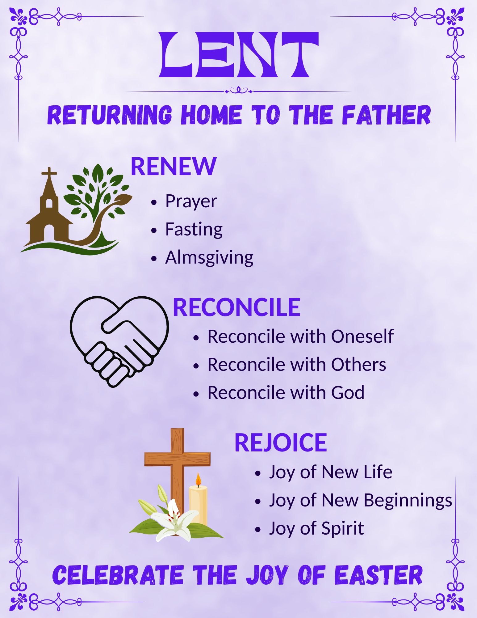 As we begin the holy season of Lent, the Lord invites us to return home to the Father. On Ash Wednesday we heard the prophet Joel: “Return to me with all your heart, for I am gracious & merciful, slow to anger, rich in mercy”. Lent is a time to open ourselves to God’s mercy, a season of conversion, humility, & trust in His love. As displayed on our bulletin boards, Our Lenten journey is guided by three simple calls: Renew, Reconcile, & Rejoice.
